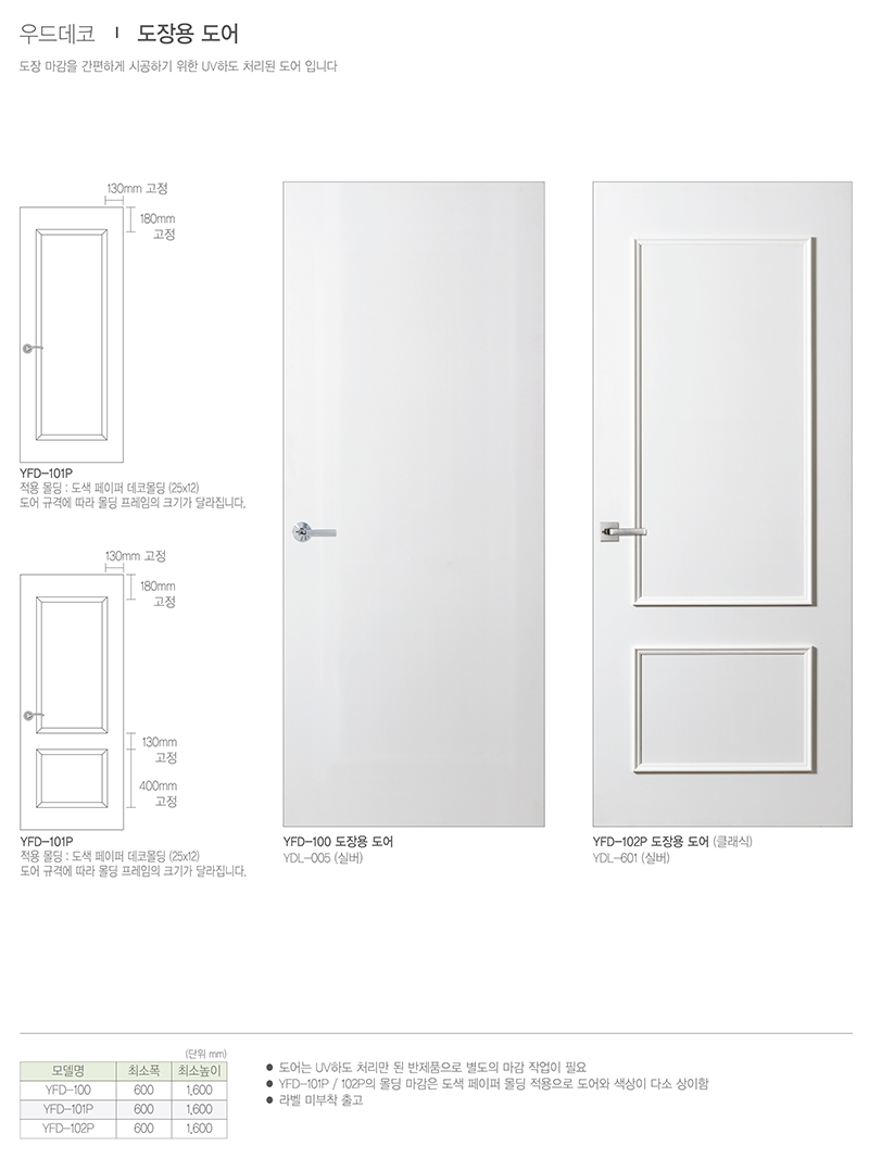 - YFD-101P와 102P 몰딩마감은 도색 페이퍼 몰딩으로 도어와 몰딩의 색상이 상이합니다.